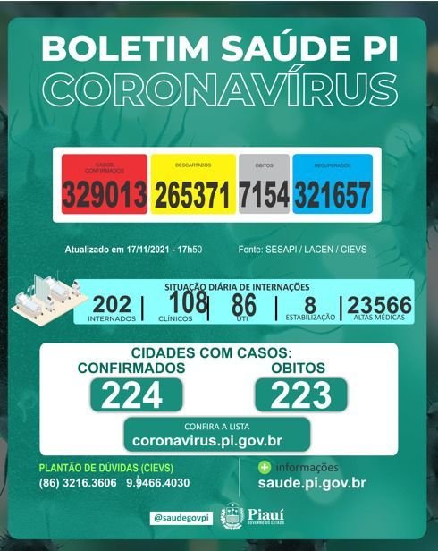 Os casos confirmados no estado somam 329.013 em todos os municípios piauienses. Já os óbitos pelo novo coronavírus chegam a 7.154 e foram registrados em 223 municípios.