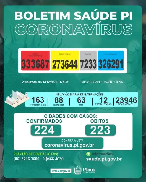 Dos leitos existentes na rede de saúde do Piauí para atendimento à Covid-19, 163 estão ocupados, sendo 88 leitos clínicos, 63 UTIS e 12 leitos de estabilização. As altas acumuladas somam 23.946 até o dia 13 de dezembro de 2021.