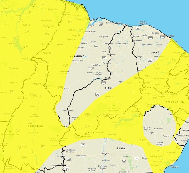 De acordo com Inmet, o alerta amarelo (perigo potencial) prevê chuvas para as regiões do sudeste piauiense e sudoeste piauiense entre 30mm e 60mm ou até 50 mm e 100/dia, com ventos intensos (60-100 km/h). Nessas áreas, há risco de corte de energia elétrica, queda de galhos de árvores, alagamentos e de descargas elétricas.