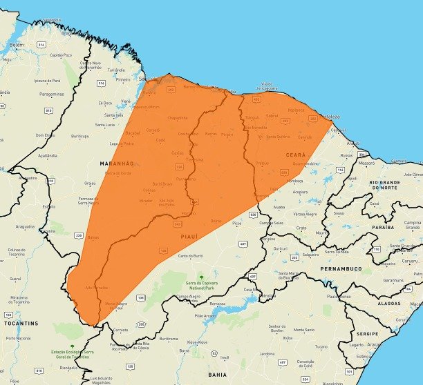 Já o alerta laranja (perigo) compreende o centro-norte piauiense, sudoeste piauiense e sudeste piauiense. Nessas áreas, pode chover entre 30 e 60 mm/h ou 50 e 100 mm/dia, com ventos intensos (60-100 km/h). Há risco de corte de energia elétrica, queda de galhos de árvores, alagamentos e de descargas elétricas.