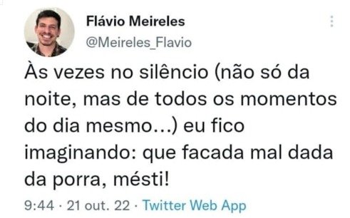Flávio Meireles publicou na semana passada em rede social um texto que continha a seguinte frase: “Às vezes no silêncio (não só da noite, mas de todos os momentos do dia mesmo…) eu fico imaginando: que facada mal dada da porra, mésti!”. O tuíte foi apagado logo após a repercussão gerada.