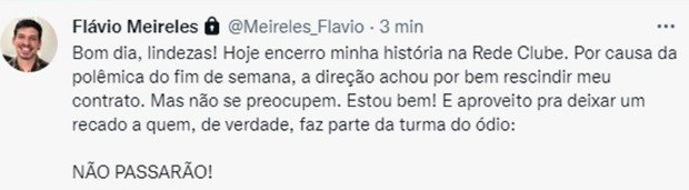 O jornalista e apresentador Flávio Meireles, da Rede Clube, confirmou nesta segunda-feira (24) sua saída da emissora. O jornalista afirmou nas suas redes sociais que a emissora decidiu por rescindir o seu contrato por ele lamentar a “facada mal dada” no presidente da República, Jair Bolsonaro, ainda durante a campanha presidencial de 2018.