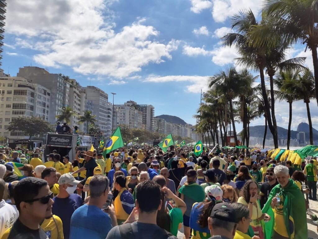 Apoiadores do presidente Jair Bolsonaro (sem partido) fazem manifestações neste domingo (1), em vários locais do Brasil, pedindo a volta do voto impresso. Na Avenida Atlântica, em Copacabana, no Rio, os manifestantes revezam-se em discursos nos carros de som dos organizadores, repetindo argumentos do presidente Jair Bolsonaro contra a votação exclusivamente digital.