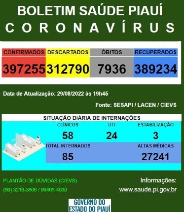 No estado, os casos confirmados somam 397.255 em todos os municípios piauienses. Já os óbitos pelo novo coronavírus chegam a 7.936 casos e foram registrados em 224 municípios.