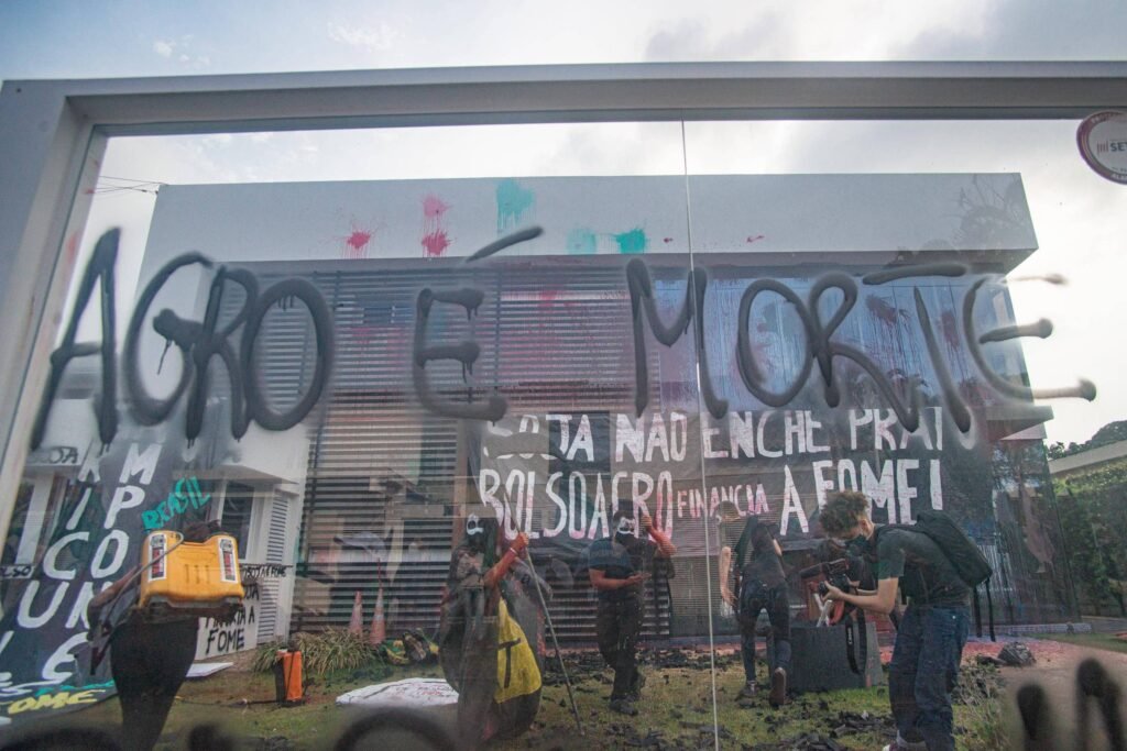 Manifestantes do Movimento Sem Terra (MST) invadiram a sede da Associação Brasileira de Produtores de Soja (Aprosoja), na manhã desta quinta-feira (14), picharam as paredes e depredaram
